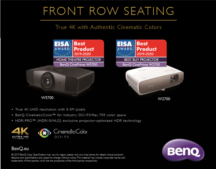 欧洲最大多媒体评论机构EISA上周颁布2019-2020年度奖项,明基广色域色准投影机W2700和W5700分别获“年度最佳购买推荐投影机”和“年度最佳家庭影院投影机”大奖。
