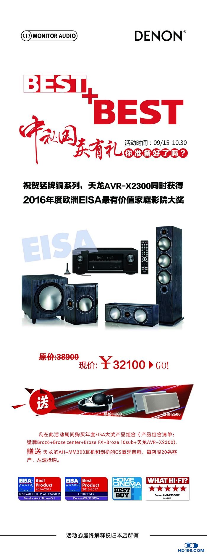 双节之际,为回馈广大烧友,深圳极品之声音响有限公司特推出EISA大奖超值组合:猛牌铜系列套装+天龙AXR-2300W。原价38900,现只要32100。还有天龙AH-MM300和剑桥G5蓝牙音响相送。