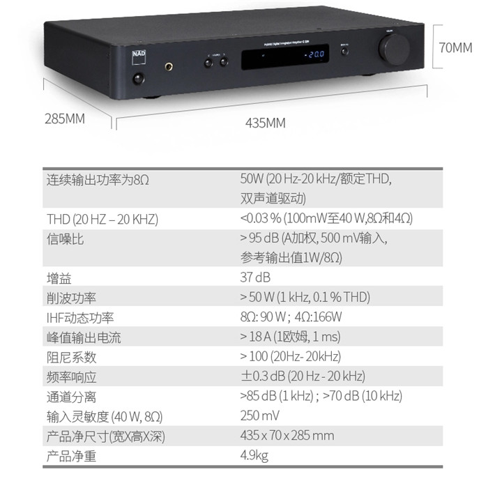 连续输出功率50W,气囊功率下可以达到 8欧/90W、 4欧/166W,当古典音乐和交响乐中,突发而来的大动态,也能保持较好的功率输出,适合市面上绝大多数的书架音箱。