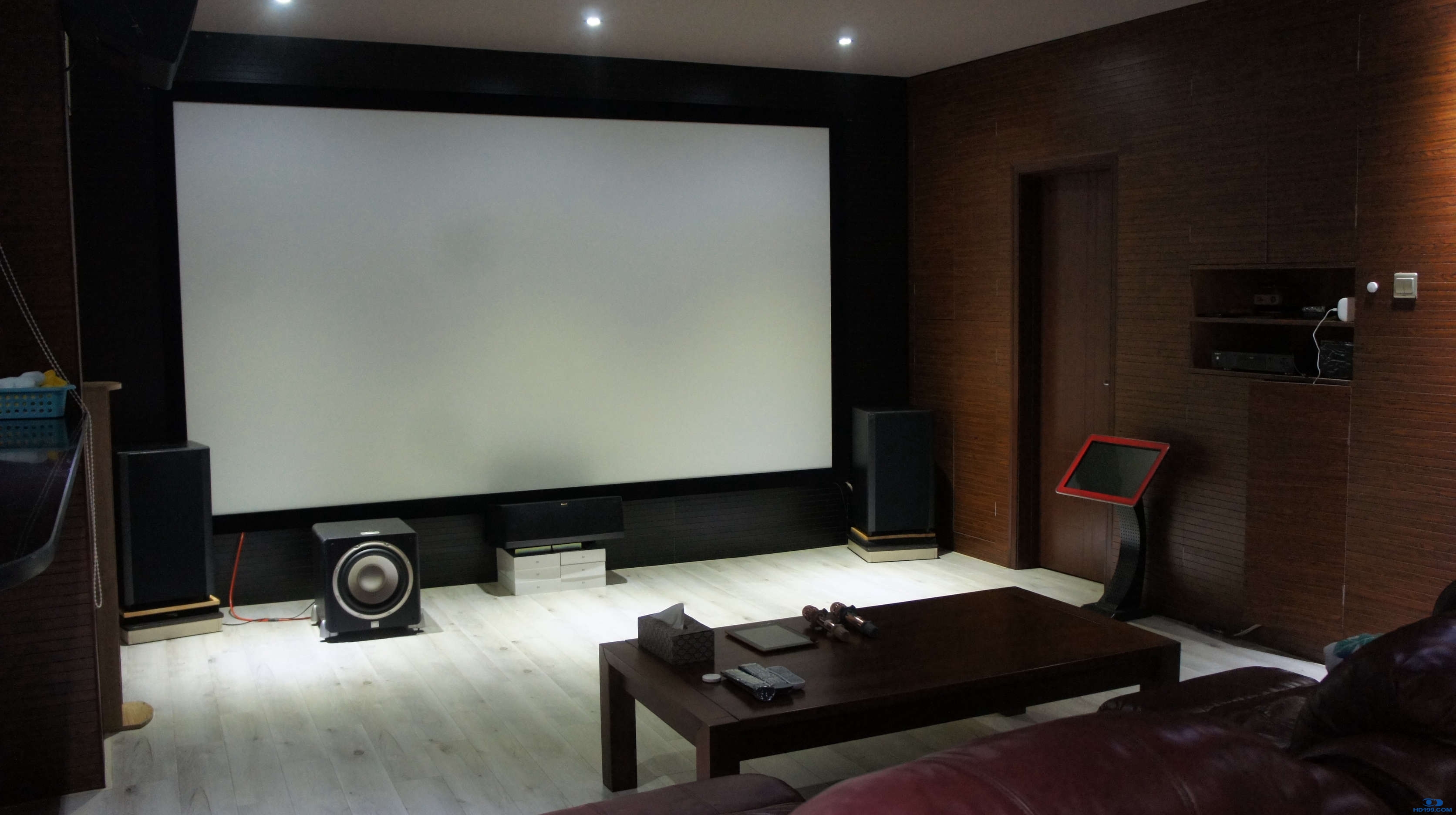 投影幕:150寸焦点1.4增益珍珠画框幕(焦点通过THX认证的MP透声幕就是使用珍珠幕作为幕基打孔制成)