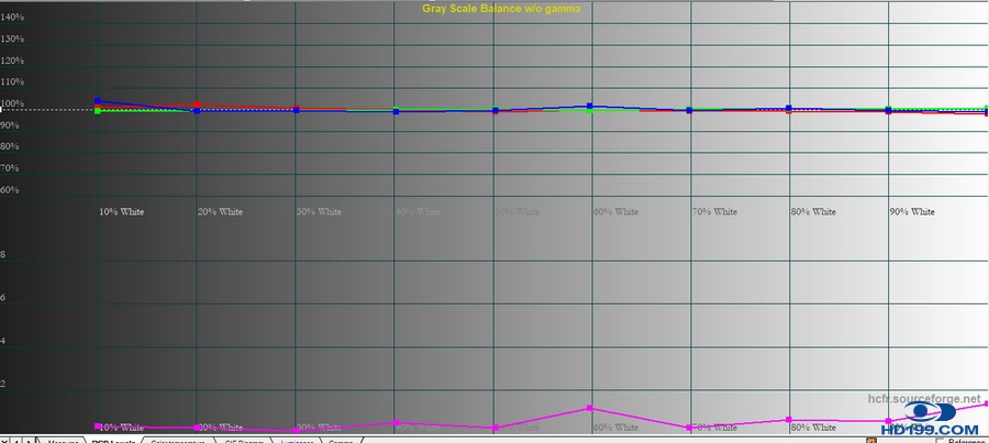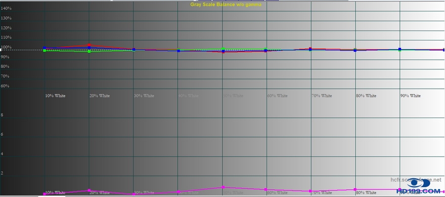 默认模式偏蓝(蓝色线比红色、绿色偏高),校正后三线重合,Delta E值全部控制在1.0以内!