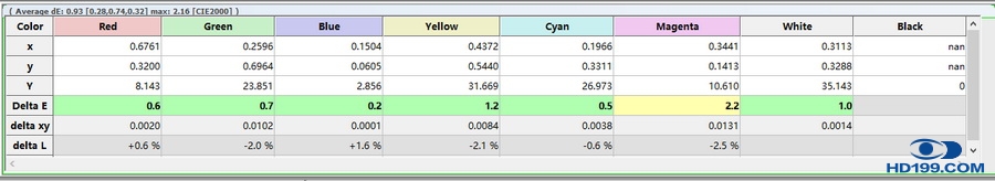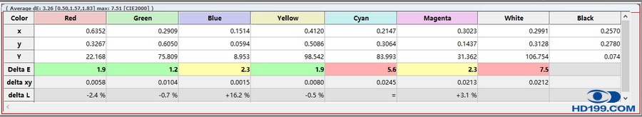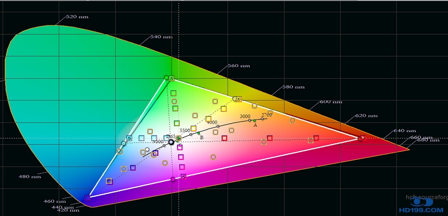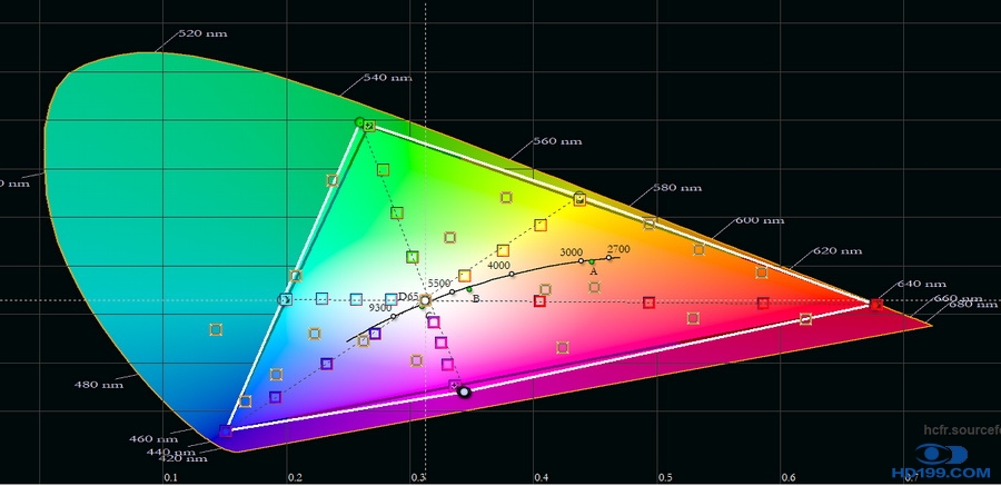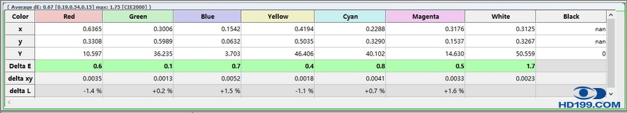 经过矫正后的色域图,100%覆盖709色域(其实默认的色域偏离也不算太大,就是绿色有些偏差,稍加调整即可达标)。