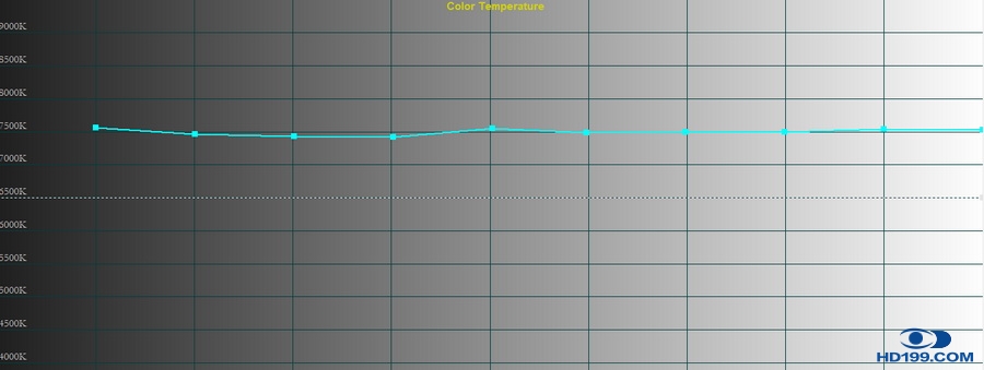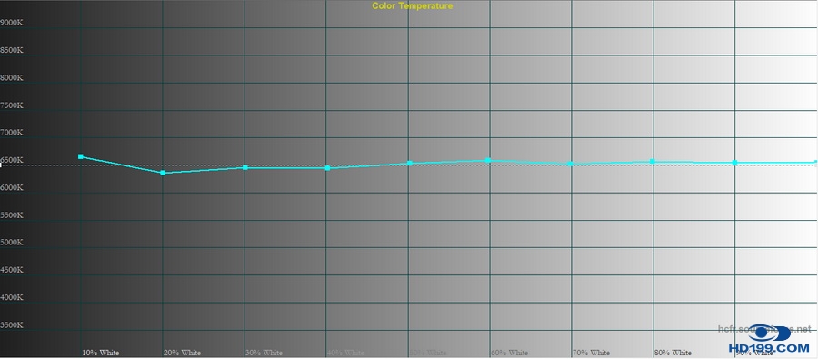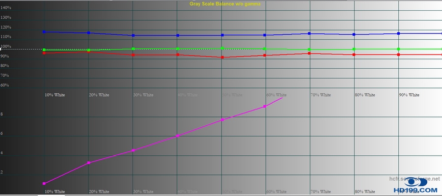 3、默认的数码影院模式依然是蓝色偏移较大,色温较高,画面整体偏蓝严重,通过校正后可以达标。