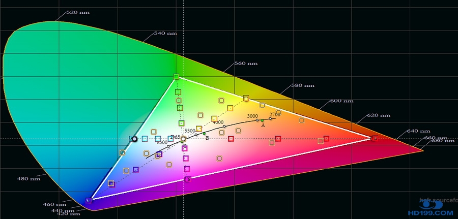 4、通过校正后的色域图,可以看到TW7400的确是覆盖了DCI-P3色域,只是绿色和品红色稍有偏差。