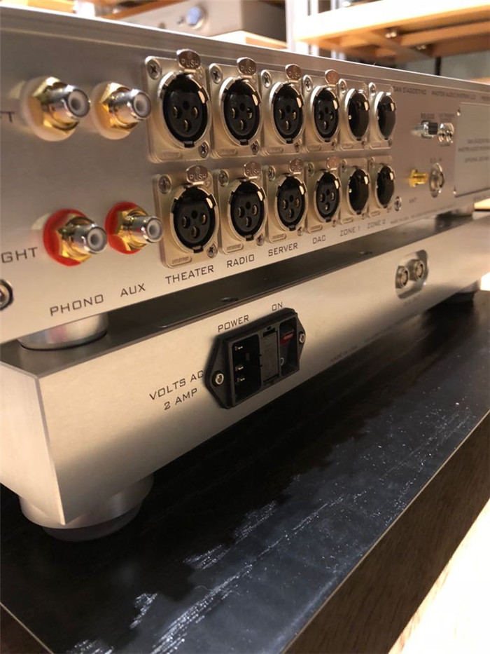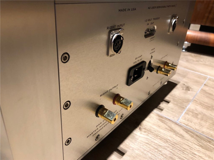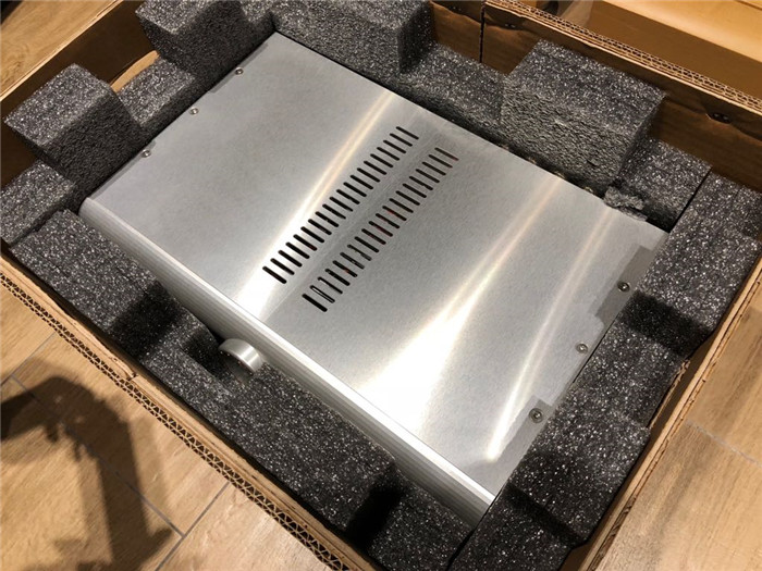 首先讲一讲后级,Progression Stereo 立体声版本的输出当然没有单声道那么大,不过每声道输出也有300W@8 ohm (600W@4 ohm, 1200W@2 ohm), 对大部份喇叭来说,应该绰绰有余了吧。Progression Stereo 用了24对SANKEN管,其两侧散热器每一块都是来自22Kg的航空铝材胚料,全机重量就达57Kg!所以开箱最好有两三个人一起啦!另外要留意的是Progression Stereo只提供XLR输入,而电源是使用20A插头的。