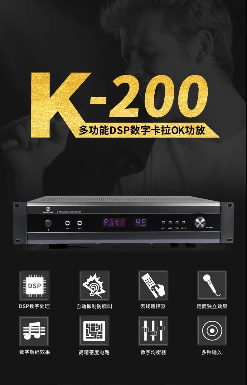 天逸K-200多功能DSP数字卡拉OK功放,采用先进的无失真动态压缩限幅、成熟而完善的电子保护线路;以及防自激及削波保护、低失真高速Hi-Fi型的放大线路保证音频信号平滑流畅、